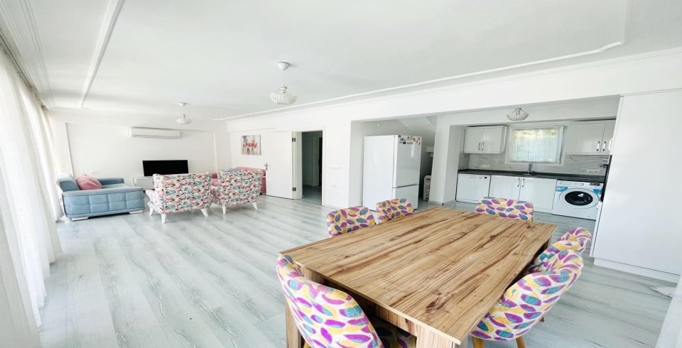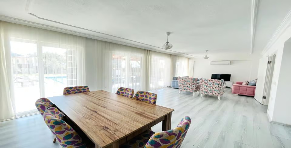 Salon: Oturma grubu, Uydu TV, 8 Kişilik yemek masası, Klima, Havuz kenarına çıkış bulunmaktadır.