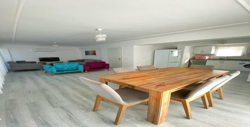 Salon: Oturma grubu, Uydu TV, 8 Kişilik yemek masası, Klima, Havuz kenarına çıkış bulunmaktadır.