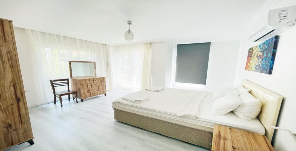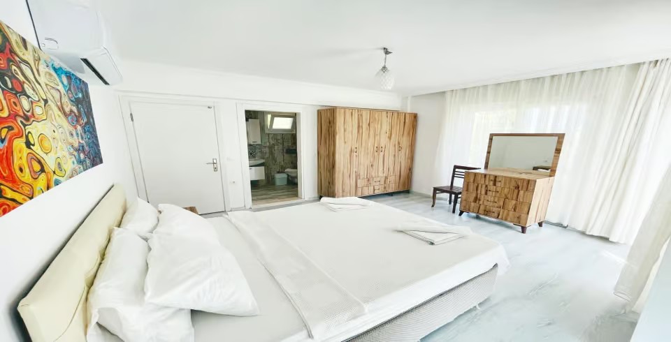 1.Yatak Odası: 1 adet çift kişilik yatak, klima, makyaj masası, komodin, elbise dolabı, banyo ve tuvalet bulunmaktadır.