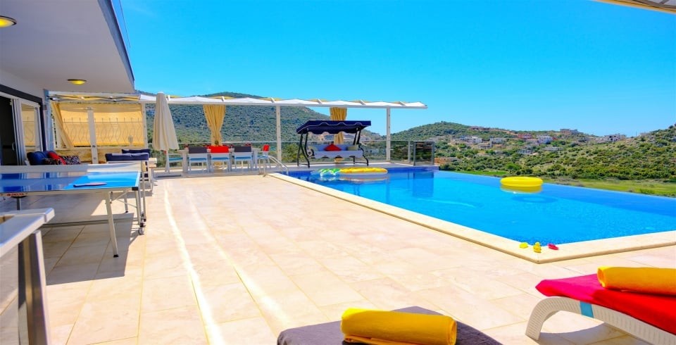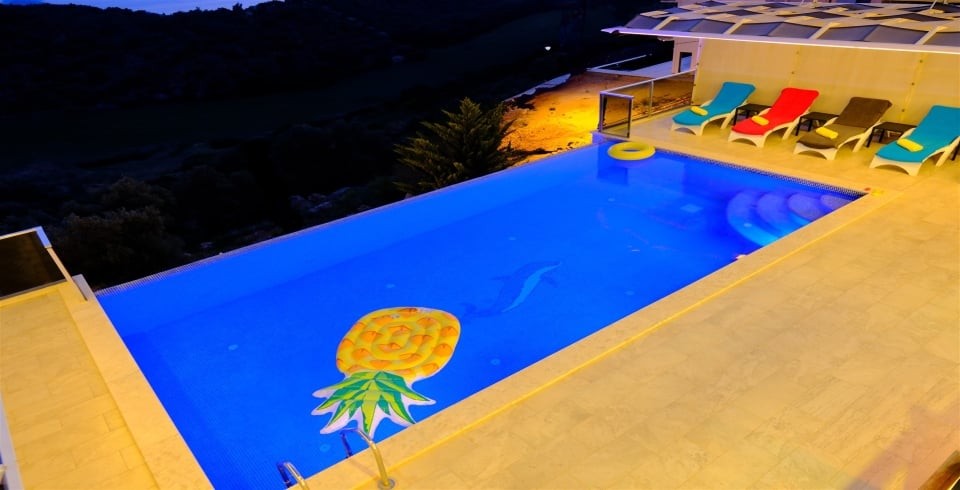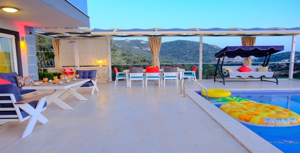Gözlerden uzak panaromik bir manzara eşliğinde Kalkan'ın tüm doğal güzelliklerini, yeşilini, mavisini seçkin bir açıdan görmenizi sağlayan lüks villamızda unutulmaz bir tatil sizi bekliyor. Villamızda her şey en ince ayrıntısına kadar düşünülmüş olup tatilini lüks ve ayrıcalıklı yaşamak isteyenler için tasarlanmıştır. Villamızın havuzu korunaklı olduğu için muhafazakar aileler için uygun bir seçenektir. Perde sistemiyle yandaki binanın havuzu görmesi engellenmiştir.