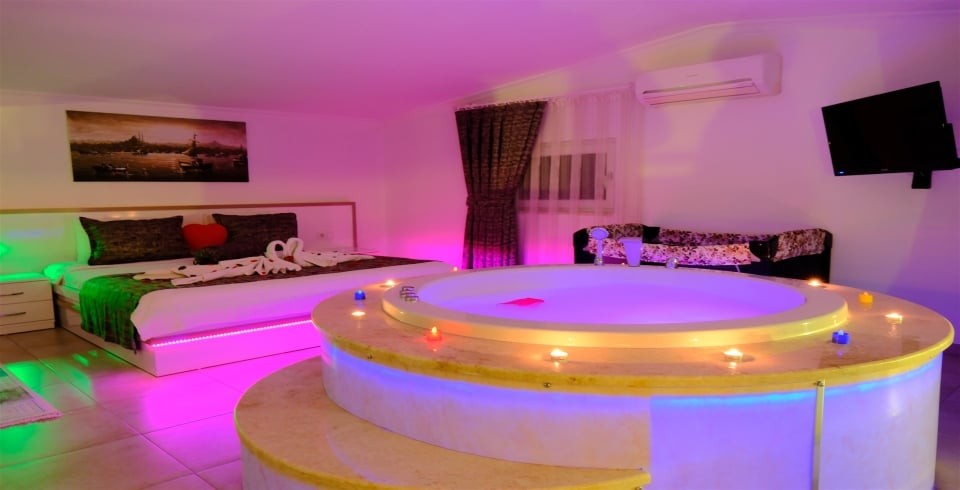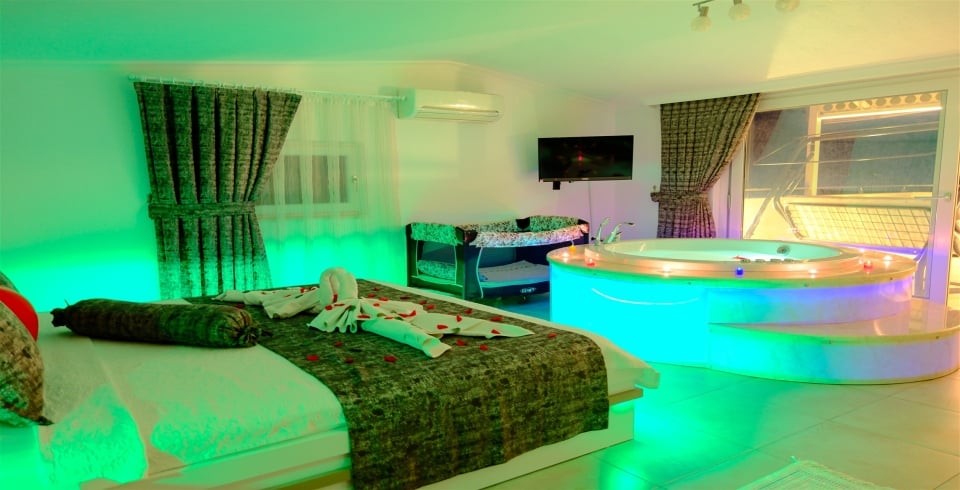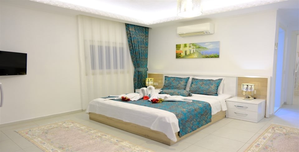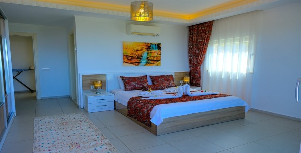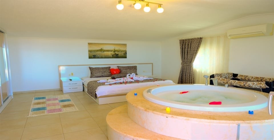 4. Yatak Odası : Çift kişilik yatak, Elbise dolabı, Komidin, Makyaj masası, TV, Klima, Jakuzi, Banyo, Terasa çıkış bulunmaktadır. Mutfak bulunmaktadır.